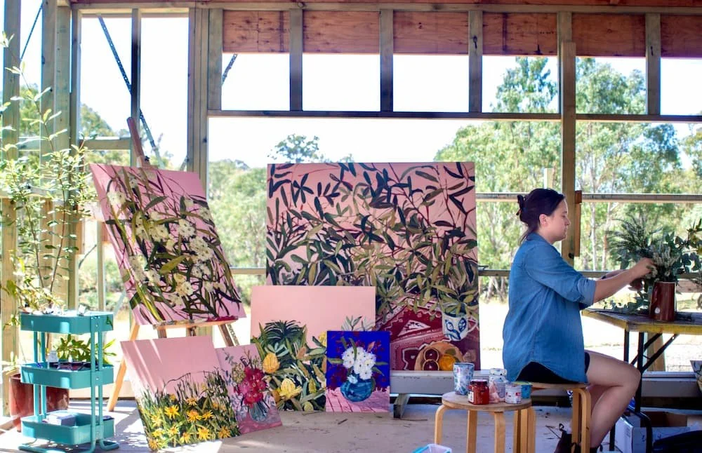 Join Emily in an all-day Botanical Still Life Workshop in the heart of the Macedon Ranges. This is not a paint-and-sip type workshop, you will be learning the technical skills of sketching and composing an acrylic painting including how to mix colours and layer them together with different brush techniques to achieve depth and movement so your painting doesn’t fall flat or look cartoonish.
